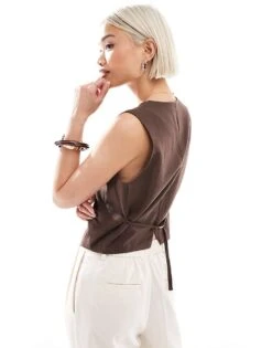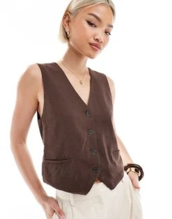 Pull&Bear Linen Look Waistcoat In Brown For Women