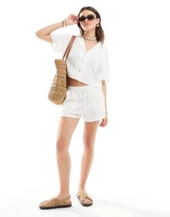 Pull&Bear Linen Short Sleeve Shirt And Short Co-ord In White