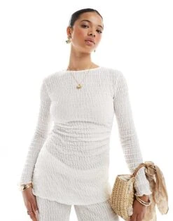 Pull&Bear Textured Long Sleeve Asymmetric Top Co-ord In Ecru
